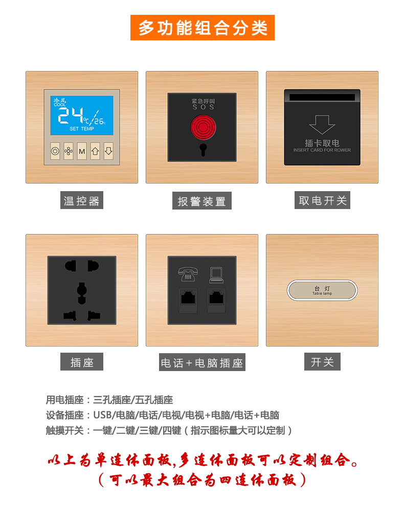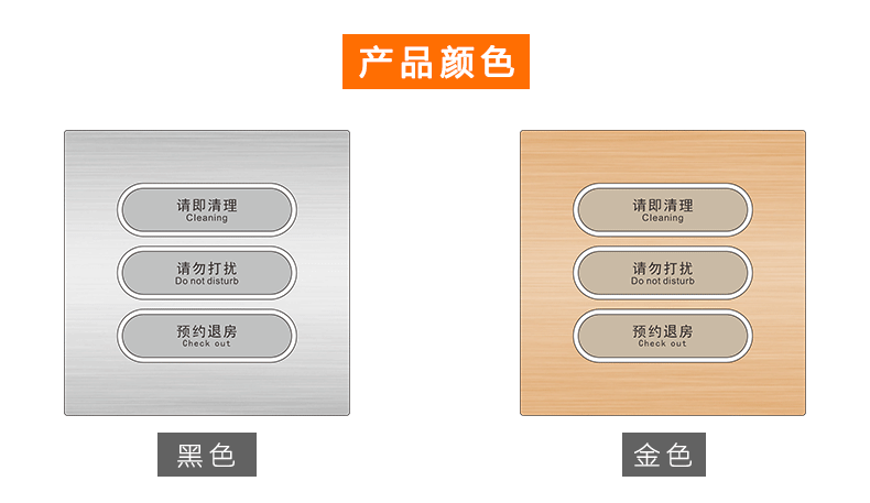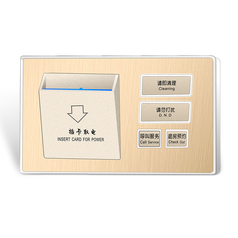 使用壽命:按鍵可達(dá)10萬(wàn)次操作; 工作功耗:強(qiáng)弱電均可做,超低功耗設(shè)計(jì),待機(jī)耗電:小于0.2W; 鋁拉絲面板,鋅合金邊框,高檔,大氣。 突出體現(xiàn)個(gè)性化酒店標(biāo)志,尊顯酒店檔次; PC阻燃絕緣材料底盒,符合國(guó)際消防標(biāo)準(zhǔn); 標(biāo)準(zhǔn)86底盒盒安裝;安裝方便、簡(jiǎn)捷; 擴(kuò)展功能:可與各大品牌客控主機(jī)匹配。